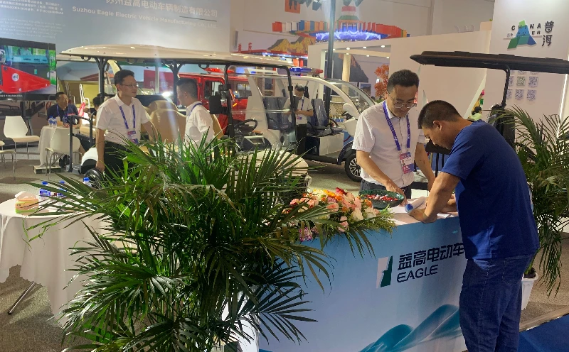 展会现场,新款电动观光车EG6232K,相比较以往电动观光车,新车更加贴合时代潮流,动力强劲,外观造型美观大方,拥有舒适实用的驾乘体验,观展者纷纷前来观摩打卡体验。